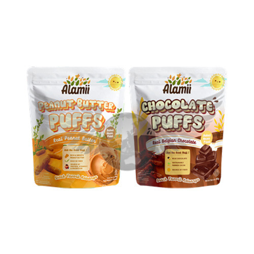• Alamii Puffs are a healthy snack for babies and children made from quality natural ingredients like rice and corn, with a soft texture that melts easily in the mouth. Baked without artificial flavor enhancers, preservatives, colors, or flavors, these snacks are safe for consumption by children aged 1 year and above, as well as adults. Available in a variety of flavors, including cheese, vegetable, chocolate, and more.