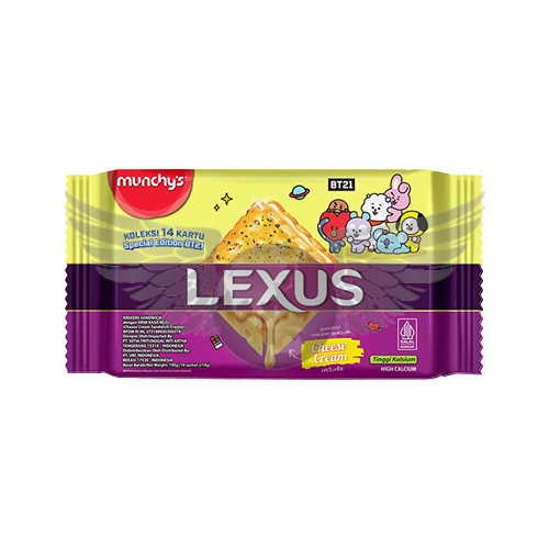 Product Description : Munchy’s Lexus Sandwich Crackers BT21 Special Edition are crispy sandwich crackers filled with creamy chocolate or cheese filling, and come with a BT21 collectible card and/or Red Sachet. Designed to be enjoyed anytime, these products are available at your nearest store.